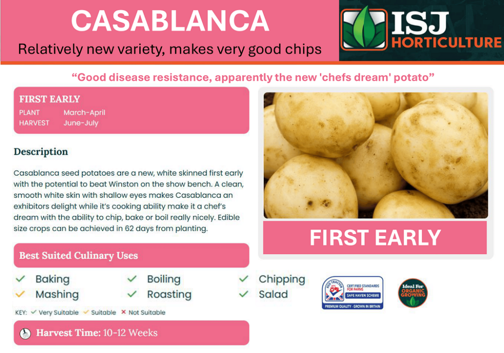 - First earlies: Caledonian Pearl, Casablanca, Duke of York, Red Duke of York.